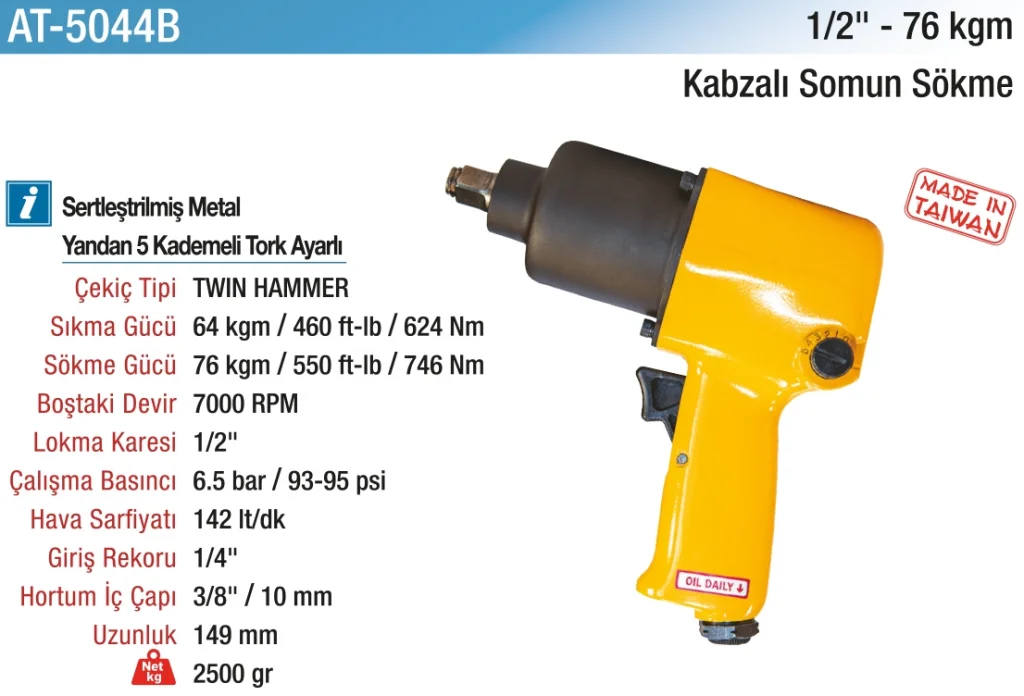 Hepsicinde 1/2" 76 kg. 7000 RPM Kabzalı Havalı Somun Sökme, profesyonel kullanım için tasarlanmış yüksek kaliteli bir üründür. Dayanıklı yapısı ve yüksek performansı sayesinde işlerinizi hızlı ve kolay bir şekilde tamamlamanıza yardımcı olur. Bu havalı somun sökme cihazı, her türlü somunu kolayca sökmenizi sağlayacak işlevselliği ile ön plana çıkar.