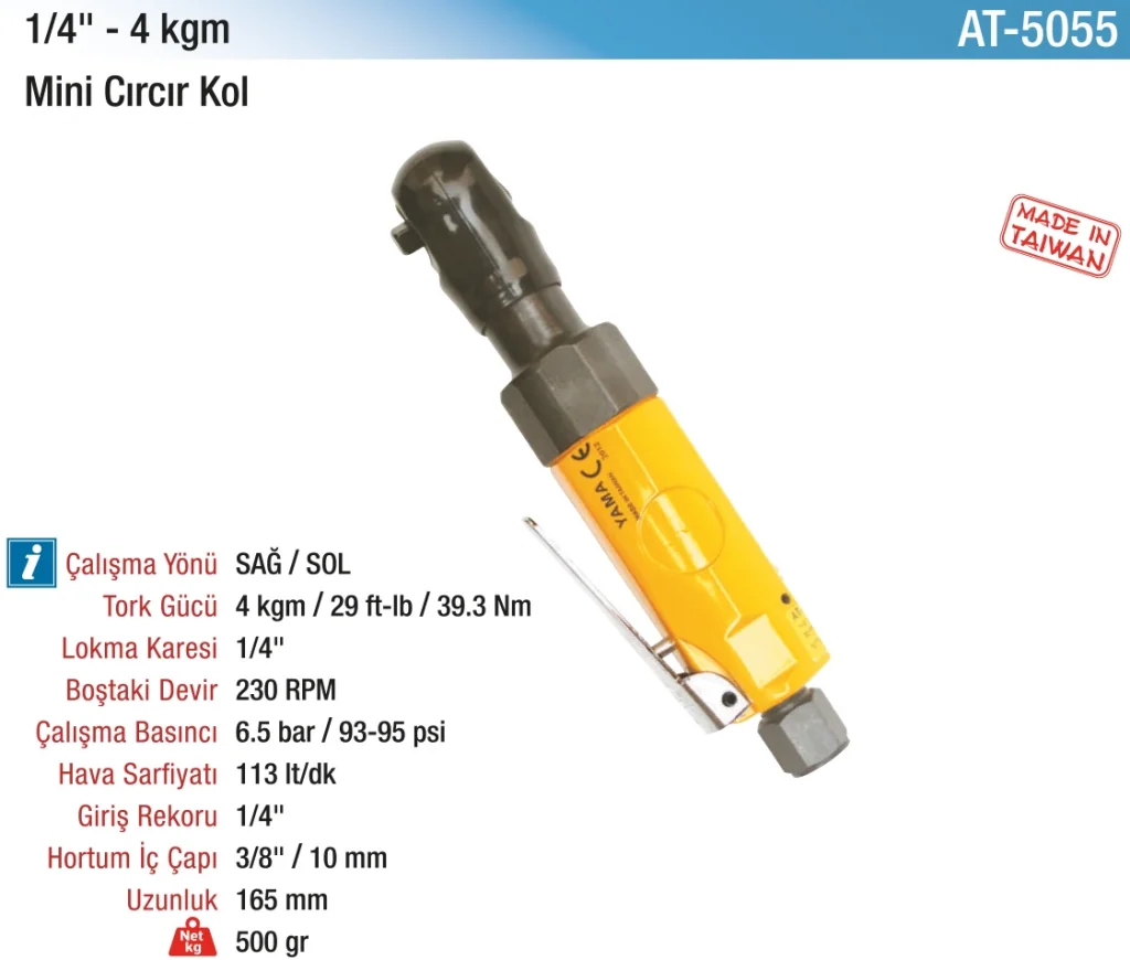 1/4" 4 kg 230 RPM Mini Havalı Cırcır Kol, kompakt tasarımına rağmen büyük işler başaran güçlü bir yardımcıdır. Profesyoneller için vazgeçilmez bir pnömatik araçtır.