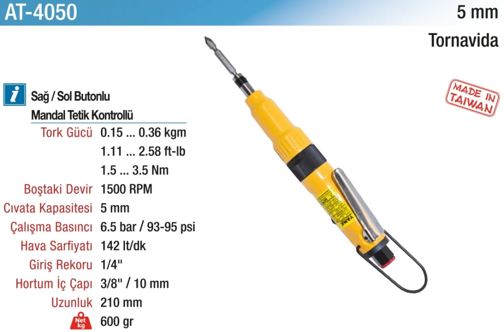 Havalı motor teknolojisi, bu tornavidayı daha hafif ve güçlü hale getirir. Ayrıca, hava gücü ile çalışması, sürekli enerji ihtiyacını ortadan kaldırır ve daha uzun süreli kullanım imkanı sunar. Bu tornavida, montaj, onarım, bakım gibi işlemler için endüstriyel atölyelerde veya ağır işlerde güvenle kullanılabilir.