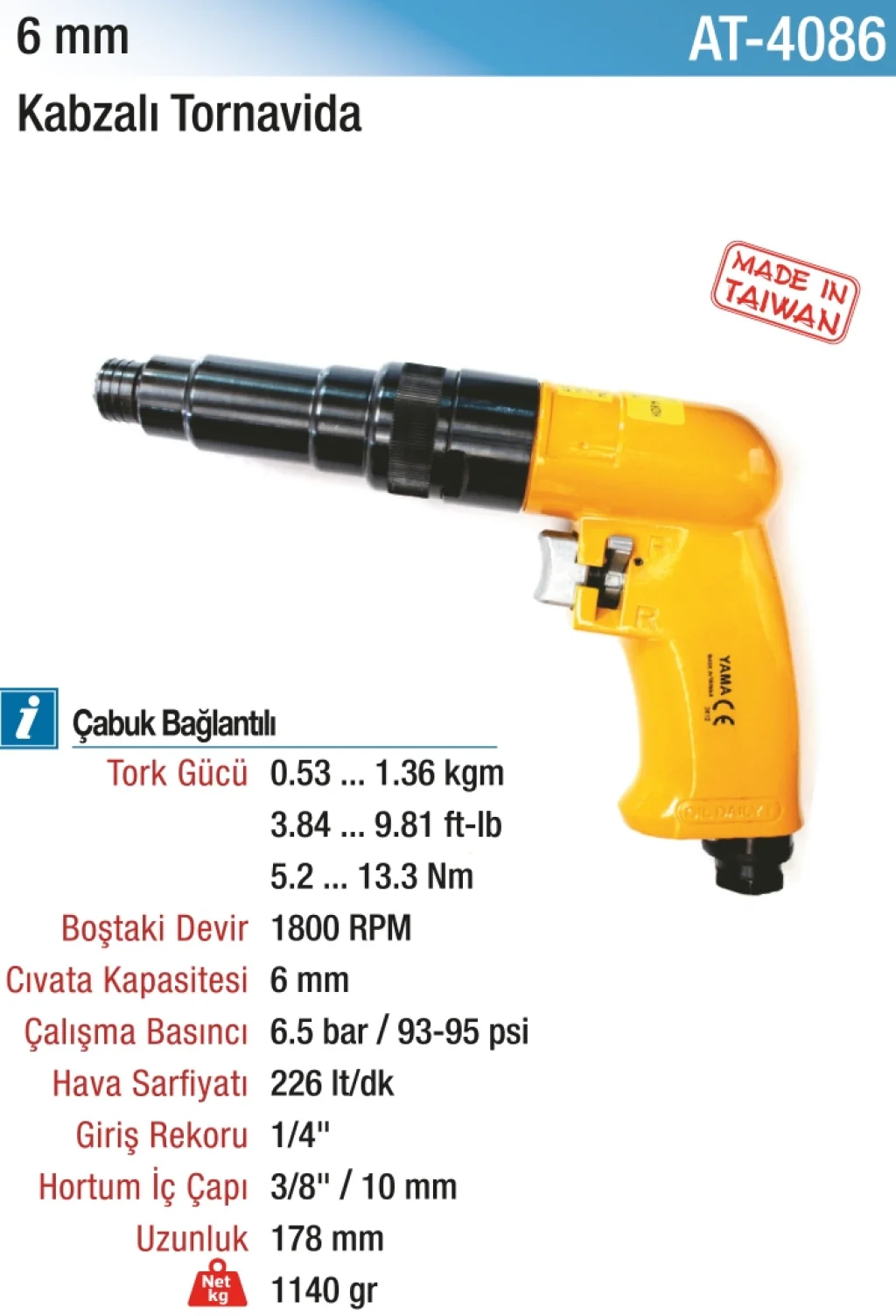 6mm 1800 RPM Kabzalı Tip Tornavida - Çubuk Bağlantılı, endüstriyel kullanım için tasarlanmış güçlü bir vidalama aracıdır. 1800 RPM hız kapasitesi, hızlı ve etkili vidalama işlemleri yapmanıza olanak tanır. Bu hızlı devir hızı, büyük montaj ve onarım projelerinde zaman kazandırır ve işlemlerinizi hızla tamamlamanızı sağlar.