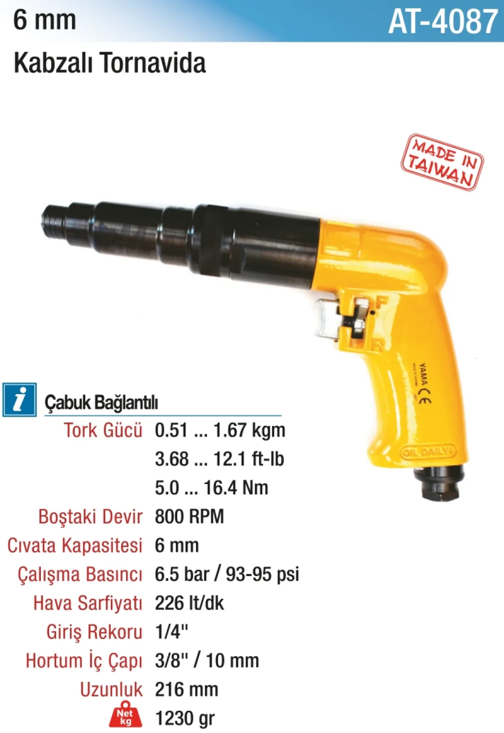 6mm 800 RPM Kabzalı Tip Tornavida – Çubuk Bağlantılı modeli, hassas vidalama işlemleri için tasarlanmış, düşük devirli ama güçlü bir havalı tornavidadır. 800 RPM devir hızı sayesinde aşırı güç uygulamadan, kontrollü ve güvenli vidalama imkânı sunar. Bu da cihazı özellikle küçük vidalarla çalışan ve hassasiyet gerektiren uygulamalar için ideal hale getirir.