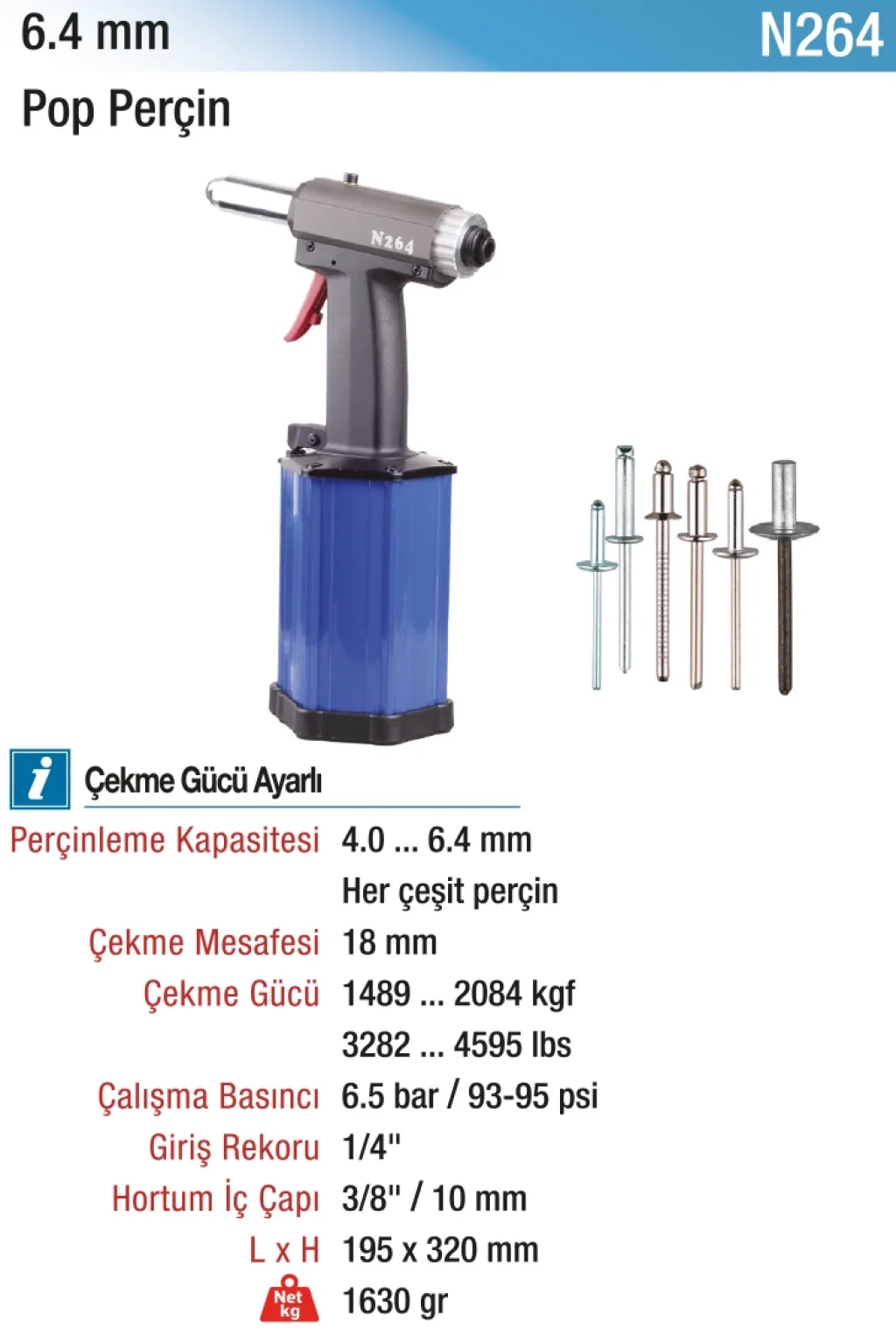 Manuel mekanizması ile güvenli ve hızlı perçinleme sağlar. Özellikle sanayi tipi uygulamalarda, inşaat, otomotiv ve ağır hizmet sahalarında yaygın olarak tercih edilir. Kalın perçinlerde dahi güvenli sabitleme sunarak işlerinizi kolaylaştırır.