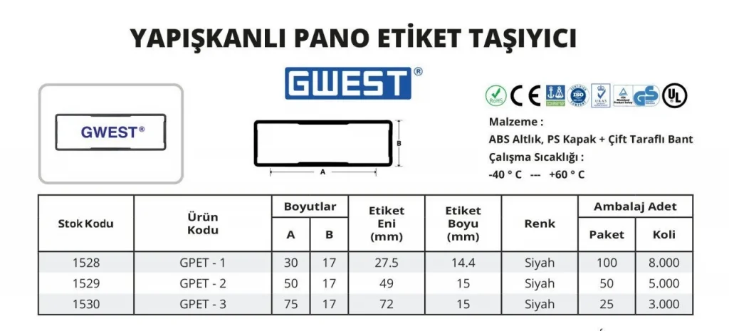 Yapışkanlı Pano Etiket Taşıyıcı, etiketlerinizin düzenli bir şekilde taşınması ve kolayca yerleştirilmesi için özel olarak tasarlanmış bir üründür. Yapışkanlı yapısı, herhangi bir pano veya levha yüzeyine kolayca uygulanmasını sağlar. Bu etiket taşıyıcı, özellikle endüstriyel alanlar, ofisler ve depolama alanlarında kullanılarak hızlı ve kolay etiket erişimi sağlar.